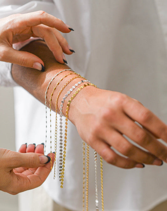 CHAINS are available in 14k gold fill, sterling silver, rose gold fill, and solid 14k gold. We are always bringing in new gorgeous chains and we have over 20 styles to choose from. We also have rotating seasonal colorful enamel chains. Any chain can be made into a bracelet, anklet, necklace, ring, hand chain, or waist chain! Permanent bracelet chains start at $45 with ann anverage of $60 and are priced by style (browse below!) Anklets are an additional $15 and necklaces are an additional $30 on top of the bracelet price. We can’t wait to see what you choose!
